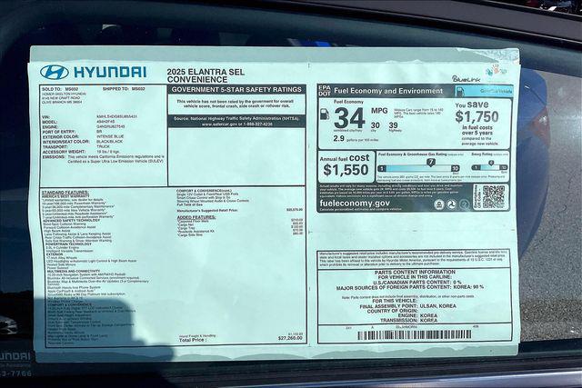 Intense Blue 2025 Hyundai Elantra SEL FWD CVT I4At Homer Skelton Hyundai we are dedicated to providing exceptional service and a great car-buying experience. With our extensive selection of Hyundai vehicles you'll find the perfect vehicle to meet your lifestyle and budget. Our knowledgeable and friendly team is here to assist you every step of the way ensuring that you make an informed decision. We value transparency integrity and building long-lasting relationships with our customers. Visit us today and discover why Homer Skelton Hyundai stands out from the rest. Price includes the following incentives some customers may not qualify for all incentives. See Dealer for details.: $1250 - Hyundai HMF Dealer Choice : $1250 discount and 5.99% APR for 24 months. $44.32 per $1000 financed. Available to well qualified buyers who finance through Hyundai Motor Finance. H704. Exp. 04/30/2025
