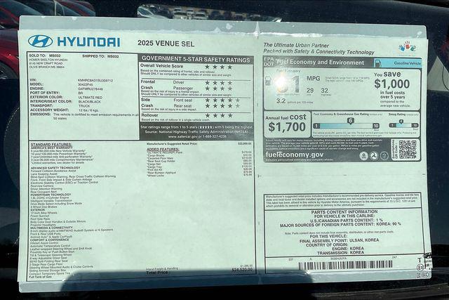 Ultimate Red 2025 Hyundai Venue SEL FWD CVT I4At Homer Skelton Hyundai we are dedicated to providing exceptional service and a great car-buying experience. With our extensive selection of Hyundai vehicles you'll find the perfect vehicle to meet your lifestyle and budget. Our knowledgeable and friendly team is here to assist you every step of the way ensuring that you make an informed decision. We value transparency integrity and building long-lasting relationships with our customers. Visit us today and discover why Homer Skelton Hyundai stands out from the rest.