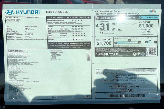 Mirage Green 2025 Hyundai Venue SEL FWD CVT I4At Homer Skelton Hyundai we are dedicated to providing exceptional service and a great car-buying experience. With our extensive selection of Hyundai vehicles you'll find the perfect vehicle to meet your lifestyle and budget. Our knowledgeable and friendly team is here to assist you every step of the way ensuring that you make an informed decision. We value transparency integrity and building long-lasting relationships with our customers. Visit us today and discover why Homer Skelton Hyundai stands out from the rest.